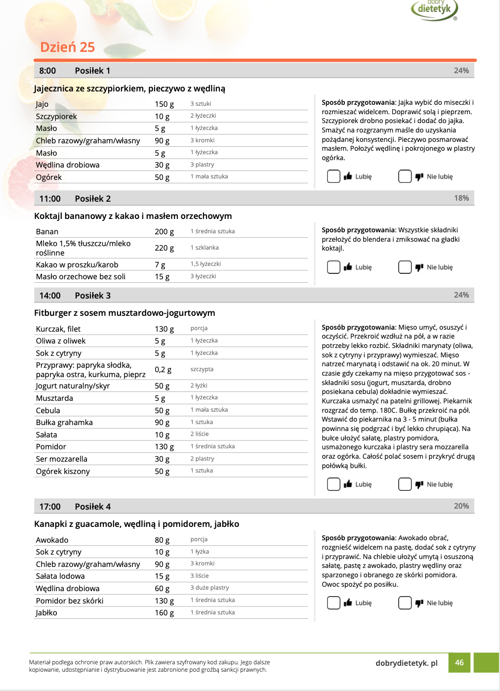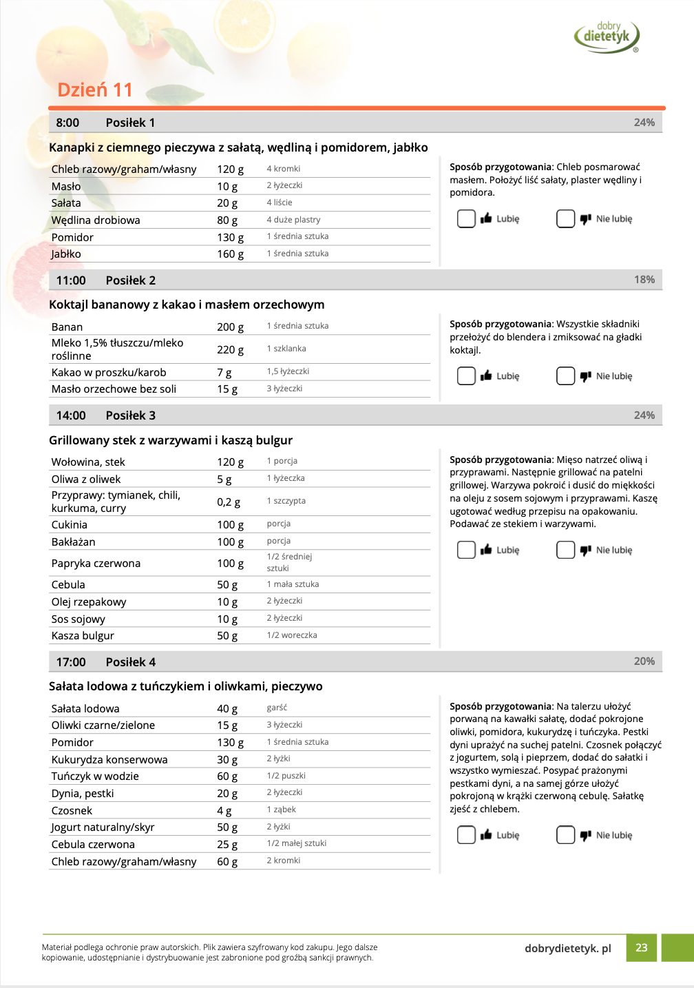 w formie propozycji posiłków (zamiast pojedynczych jadłospisów jednodniowych, przygotowano propozycje kilku propozycji dań na każdy posiłek). Tutaj nie uzależniamy Cię od tego jakie masz np. w danym dniu zjeść śniadanie czy obiad, tylko sam wybierasz sobie ulubione danie z kilku przedstawionych przez nas propozycji.
