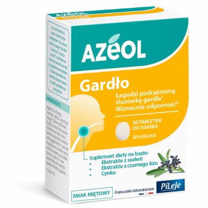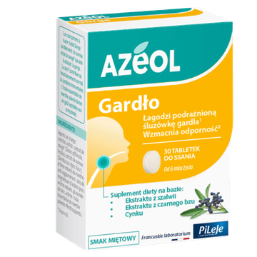 Azeol Gardło jest suplementem diety opracowanym na bazie: ekstraktu z szałwii lekarskiej, ekstraktu z czarnego bzu oraz cynku. Szałwia łagodzi podrażnioną śluzówkę gardła, a cynk pomaga w prawidłowym funkcjonowaniu układu odpornościowego. Przeciwwskazania: niewskazany u kobiet w ciąży lub karmiących oraz dzieci poniżej 12 roku życia. Nie przekraczać zalecanej porcji do spożycia w ciągu dnia, nadmierne użycie może wywołać efekt przeczyszczający.Rekomendowany do suplementacji w: