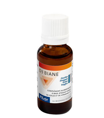D3 Biane w kroplach to suplement diety na bazie oleju rzepakowego i witaminy D3. Suplement diety zapewnia 100% dziennego zapotrzebowania w witaminę D3, która przyczynia się do utrzymania właściwej struktury kostnej i prawidłowego funkcjonowania systemu odpornościowego.Rekomendowany do suplementacji w: