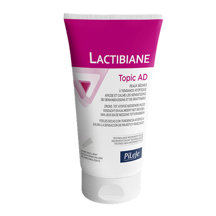 Lactibiane Topic AD to balsam zmiękczający skórę suchą z tendencją do atopii. Koi oraz łagodzi uczucie swędzenia. Zalecany do stosowania już od 1 dnia życia. Balsam probiotyczny powstał na bazie aktywnych składników zapewniających kompleksowe działanie dla skóry atopowej: Lizat fermentacyjny Lactobacillus zwiększa różnorodność komensalnej mikroflory skóry i utrzymuje równowagę mikrobiotyczną skóry. Prebiotyk α-gluko-oligosacharydowy chroni mikrobiotę skóry. LPC i witamina B3 pomagają wzmocnić barierę skórną. Laboratoire PiLeJe opracowało pierwszy balsam zmiękczający z linii Microbiota, aby zaspokoić potrzeby skóry ze skłonnością do atopii. Lactibiane Topic AD jest odpowiedni dla niemowląt, dzieci i dorosłych.Rekomendowany do suplementacji w: